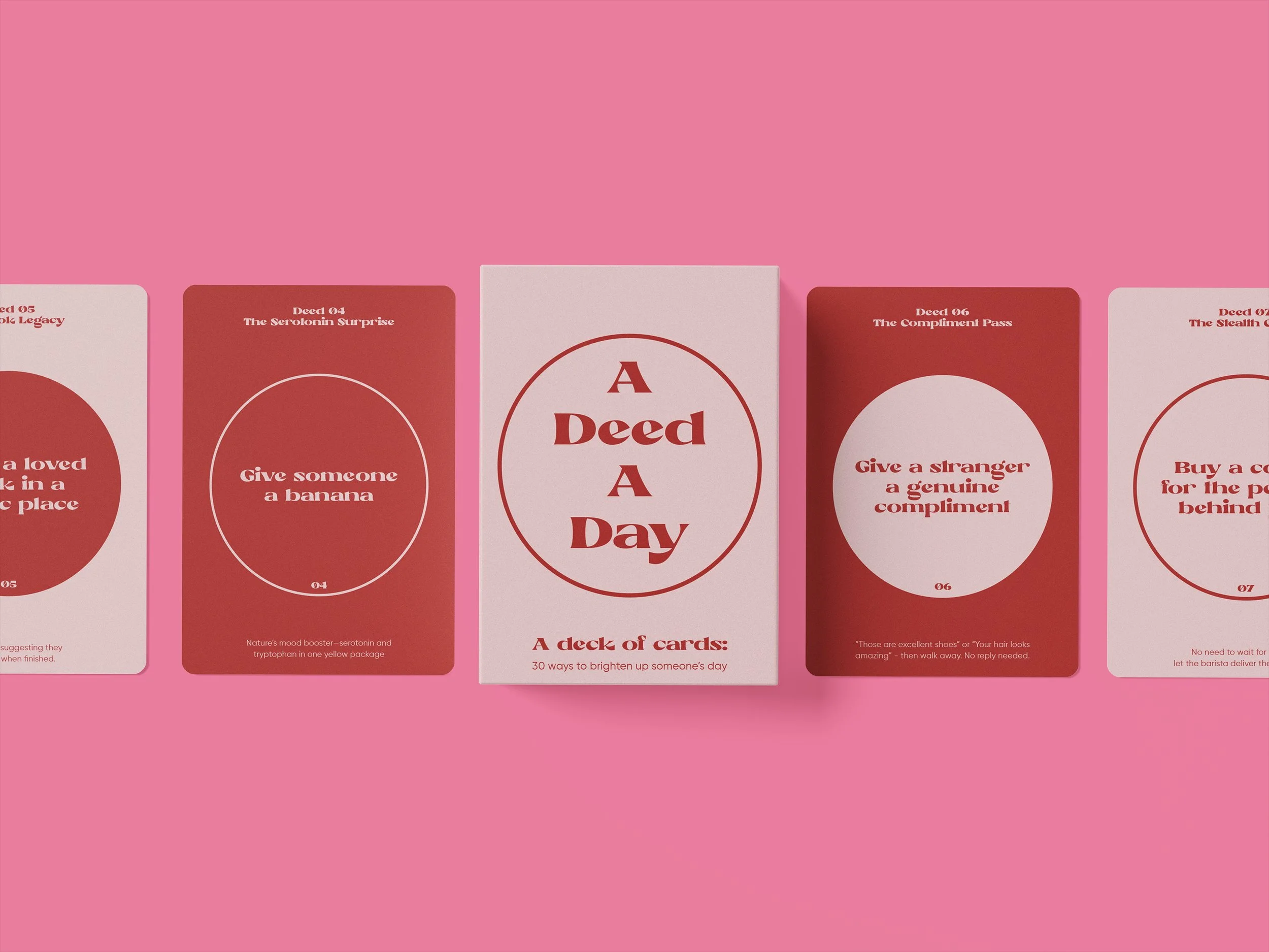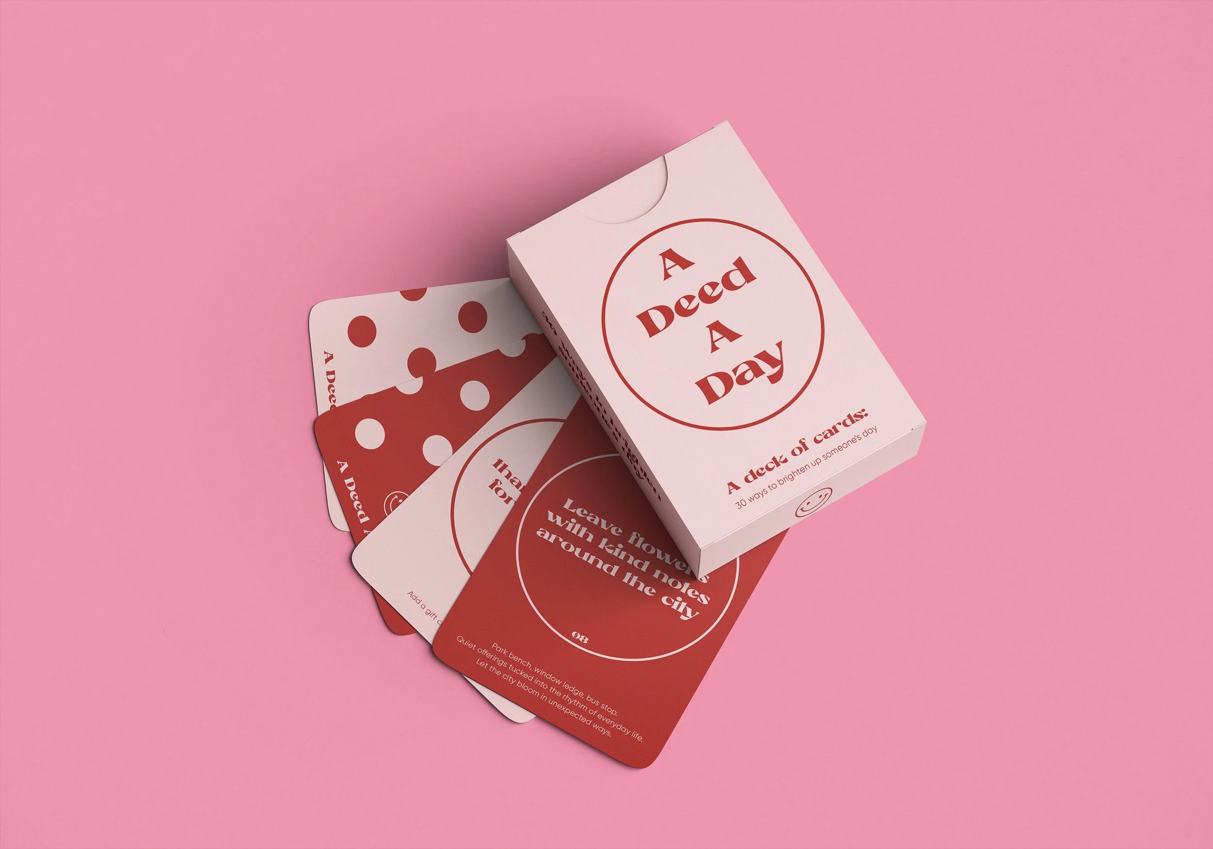 "A Deed a Day" is a thoughtfully designed deck of 30 cards, each featuring a simple yet meaningful act of kindness. Created for those who believe in quiet, everyday goodness, this project transforms abstract empathy into tangible actions. The design embraces minimalism to let the ideas speak for themselves, while the language avoids preachiness in favour of gentle nudges toward compassion. It’s a reminder that empathy thrives in small, consistent actions rather than dramatic displays. Whether used as a personal 30 day practice or given as a gift, these cards redefine goodness as something accessible, celebrating acts of quiet kindness.